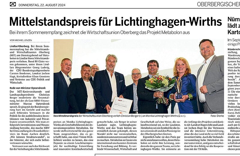 Der diesjährige Preis des Mittelstands ging an die Geschäftsführerin des Innovationsprojektes „Metabolon“, Frau Monika Lichtinghangen-Wirths. Sie wurde stellvertretend für das ganze Metabolon Team ausgezeichnet, welches es geschafft hat, aus einer Vision Wirklichkeit werden zu lassen, nämlich eine Deponie zu einem Leuchtturmprojekt für nachhaltige Entwicklung und innovative Kreislaufwirtschaft zu machen.