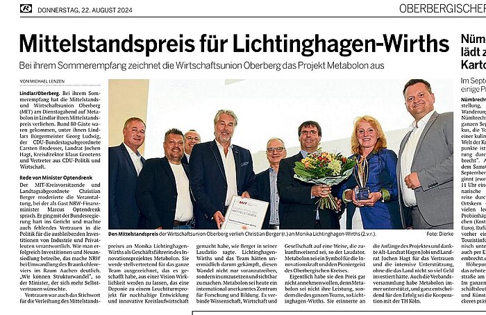 Bei ihrem Sommerempfang hat die Mittelstands- und Wirtschaftsunion Oberberg am vergangenen Dienstag auf Metabolon in Lindlar den Mittelstandspreis 2024 verliehen.